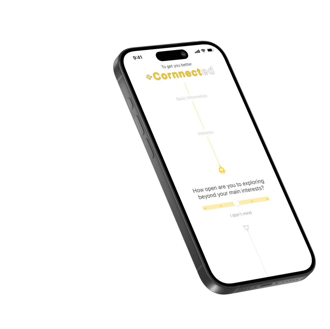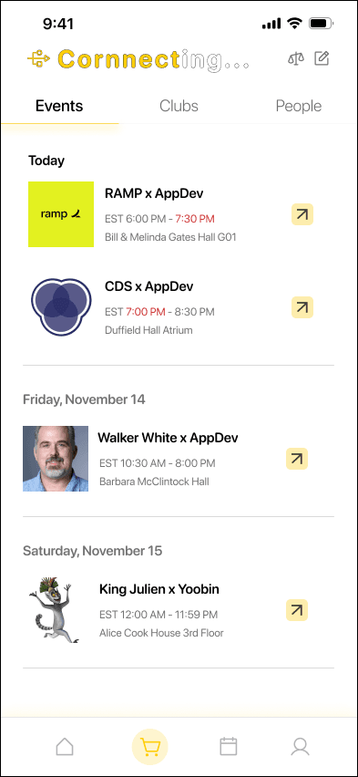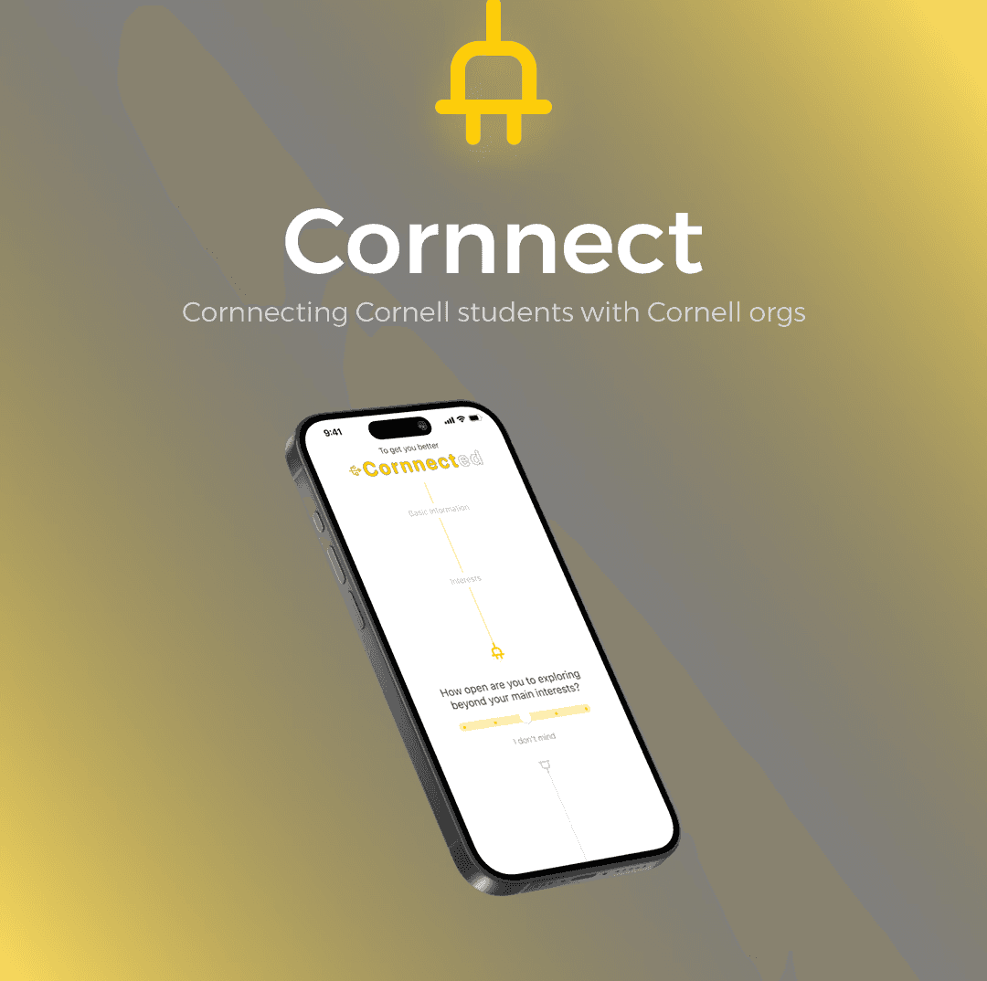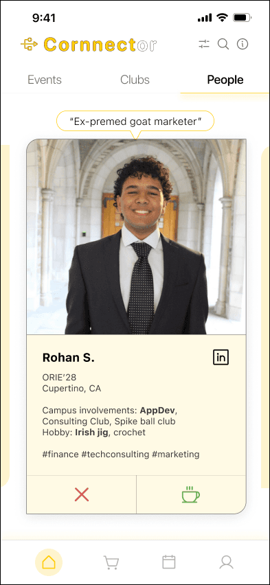 Cornnector uses the onboarding questionnaire to recommend events, clubs, and potential coffee-chat matches aligned with a user’s interests. Each person card includes a simple one-liner bio to make connecting feel personal and less intimidating.