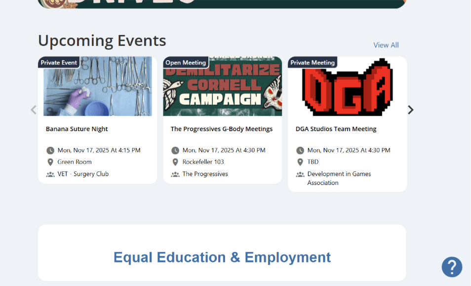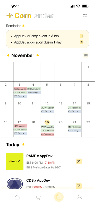 A central hub for all information sessions, recruitment events, and application deadlines. Users can filter by category or starred organizations, export events to Google Calendar, and receive reminders to stay on track. Cornlendar is color-coded and offers multiple views (month, week, day). Clicking a date expands a detailed list of events happening that day.